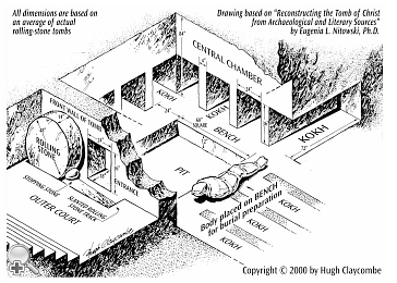 (John 19:41). Joseph of Arimathea's tomb, where Jesus was buried (see Matt 27:57-60), was like other first-century Judean tombs. This drawing is based on sixty-one such "rolling-stone" tombs that have been discovered. These tombs, carved in limestone, were affordable only by wealthy families, and they were constructed according to the laws of Judaism (see Mishnah Baba Batra 6:8). After preparation for burial, bodies were placed in the kokh (niche) which was then sealed with a rolling closure stone. Much later the dried bones were stored in ossuaries (stone boxes) within the tomb.